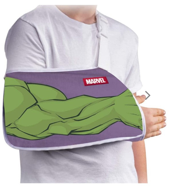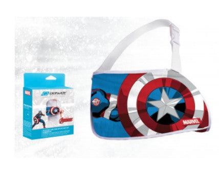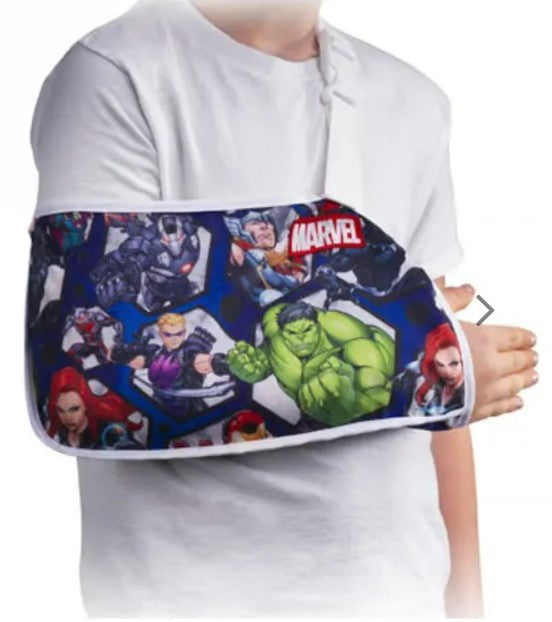 Finally, a youth arm sling that's comfortable and fun! The DonJoy® Advantage Youth Arm Sling Featuring Marvel provides mild arm support and a Marvel Super Hero design. Constructed of cotton-polyester blend, the kid's arm sling envelope aids in a comfortable fit while the adjustable strap allows for a personalized fit. Easy to put on, the Youth Arm Sling can be worn on the right or left arm. Choose your favorite Marvel character design: Avengers, The Hulk, Captain America, or Iron Man.